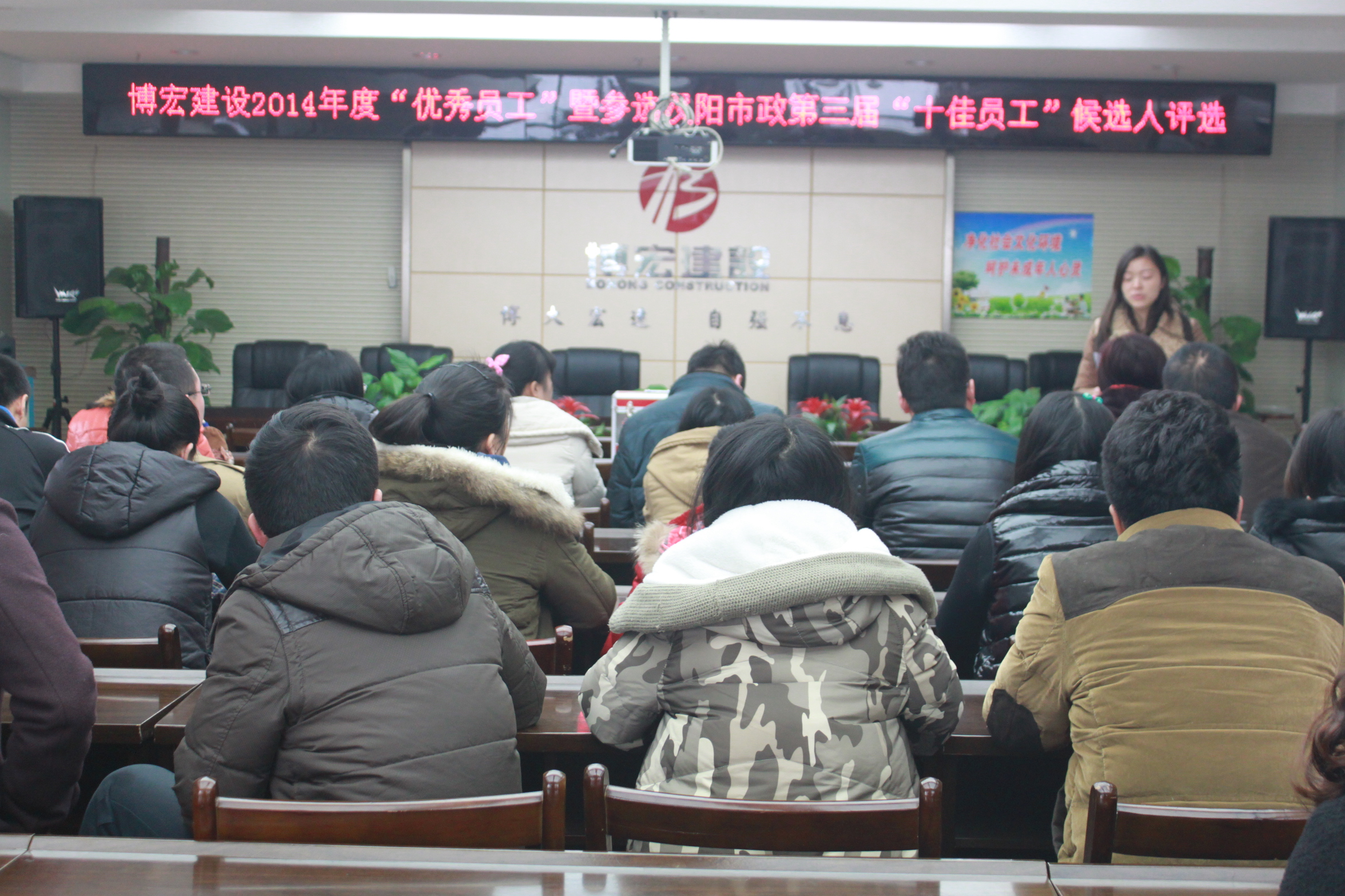 12月29日下午,武漢博宏建設有限公司在會議室舉行了2014年度“優秀員工”暨參選漢陽市政第三屆“十佳員工”候選人評比活動,旨在弘揚先進,樹立典型,營造積極向上、爭當先進的工作氛圍。博宏公司領導班子、各部室行政人員及各項目部成員參加了評選活動。