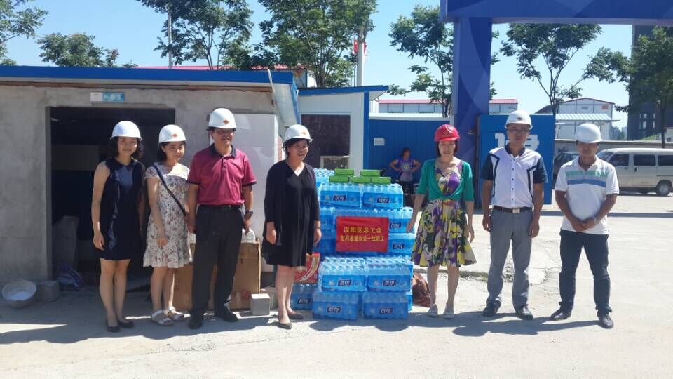 7月29日,驕陽似火,暑熱逼人,漢陽區工會喻主席、謝主任等領導來到博宏建設的芳草小學施工現場,向奮戰在建設一線的職工送去礦泉水、風油精等夏令防暑物資,向他們送去一份夏日的清涼。