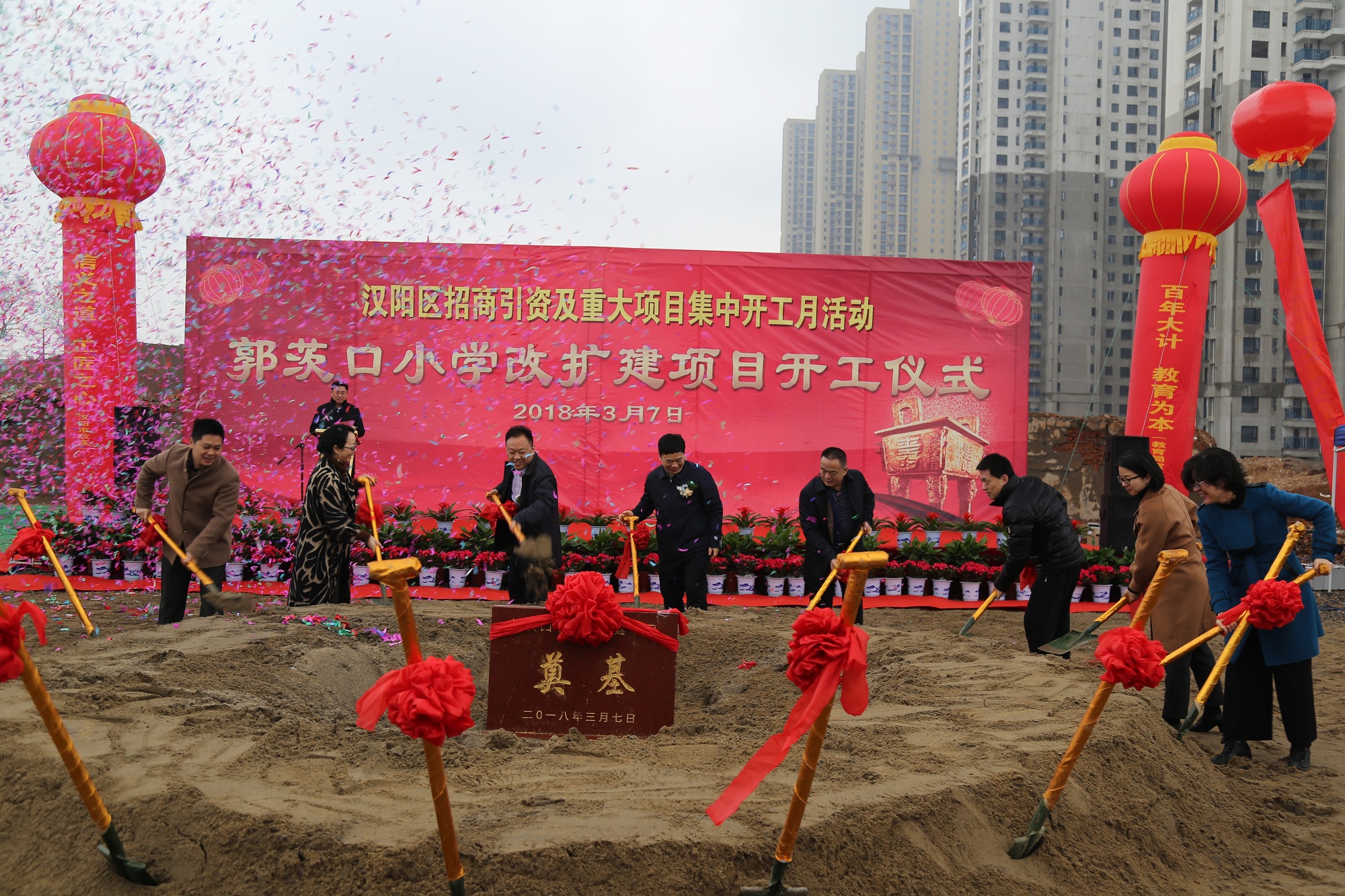 莫道春來早,更有早行人。2018年3月7日上午,漢陽區招商引資重大項目集中開工活動走進郭茨口小學改擴建項目。漢陽區委書記馬澤江,區長閻磊,區政協主席張本滿,區人大副主任黃學真,副區長蔡松、胡勇、皮惠蘭,區教育局局長施慧芳,漢陽市政總經理虞志鵬、副總經理王智高,天創房地產總經理張琴,博宏建設董事長錢濤等蒞臨開工儀式現場。