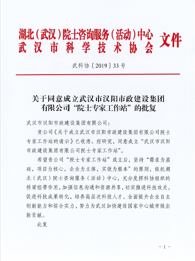 2019年5月20日,湖北(武漢)院士咨詢服務(活動)中心、武漢市科學技術協會正式批復同意成立武漢市漢陽市政建設集團有限公司院士專家工作站。