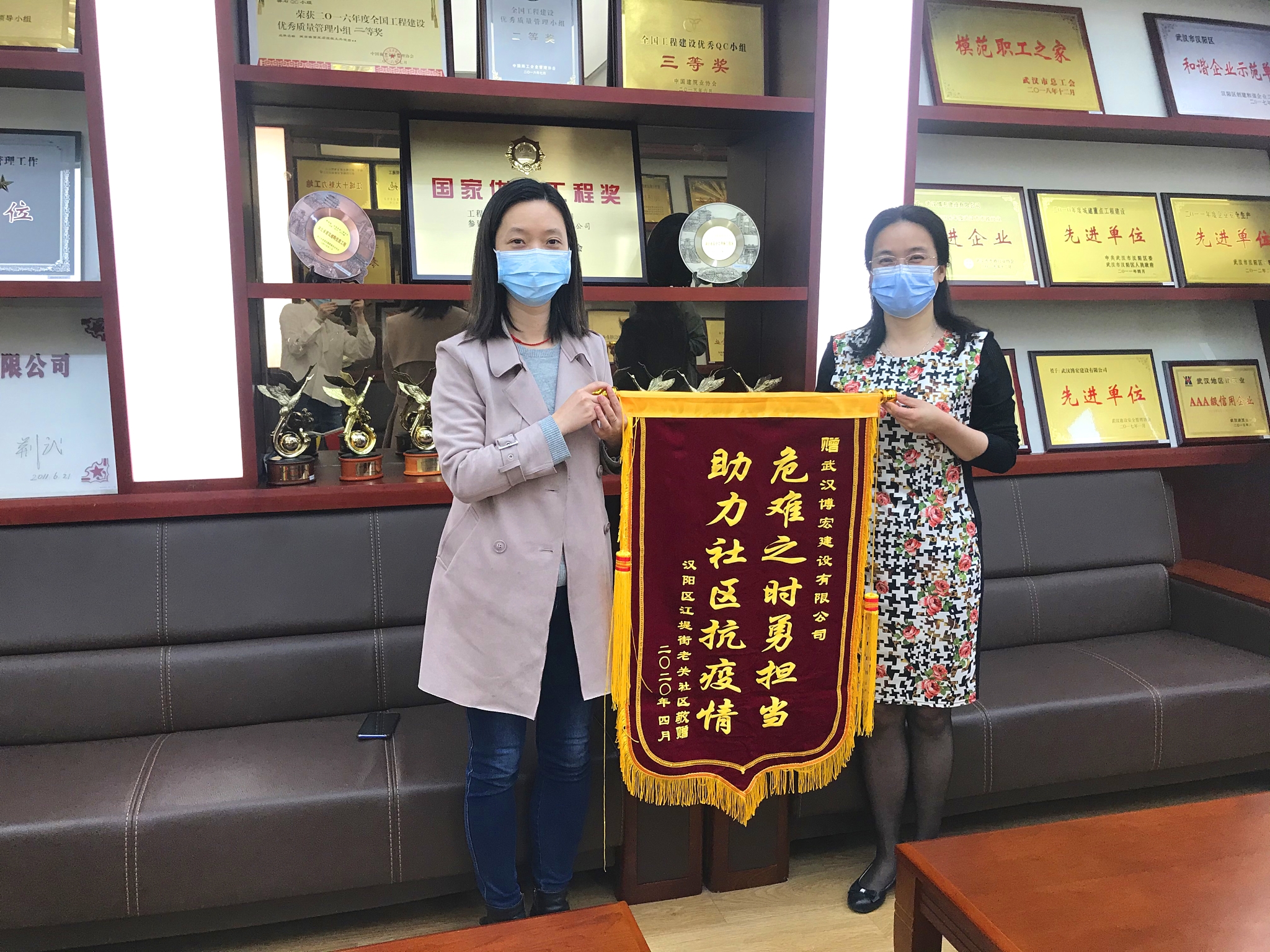 4月27日上午,武漢市漢陽區江堤街老關社區書記馮霞懷著一份感恩的心,將一面印有“危難之時勇擔當,助力社區抗疫情”的錦旗送到博宏建設支部副書記郭一清的手中,感謝博宏建設在疫情期間主動為社區提供生活保障物資的善舉。