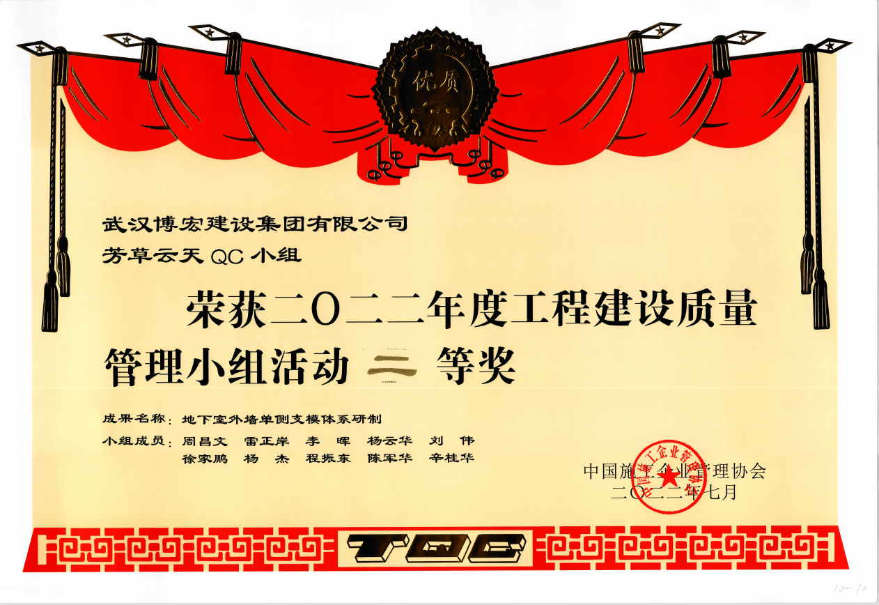 近年來,公司成立了多個QC小組,積極參與公司技術(shù)研發(fā)工作,以技術(shù)創(chuàng)新提升市場核心競爭力,努力打造新的增長極。目前,我司的QC小組課題始終堅持問題導(dǎo)向原則,緊扣技術(shù)創(chuàng)新、施工生產(chǎn)、質(zhì)量管理等重點、難點問題,積極開展QC小組攻關(guān),并參與各級協(xié)會組織的QC競賽活動,獲得省I類成果9項、II類成果5項、III類成果4項,其中1項成果榮獲武漢建筑業(yè)協(xié)會QC銀獎。