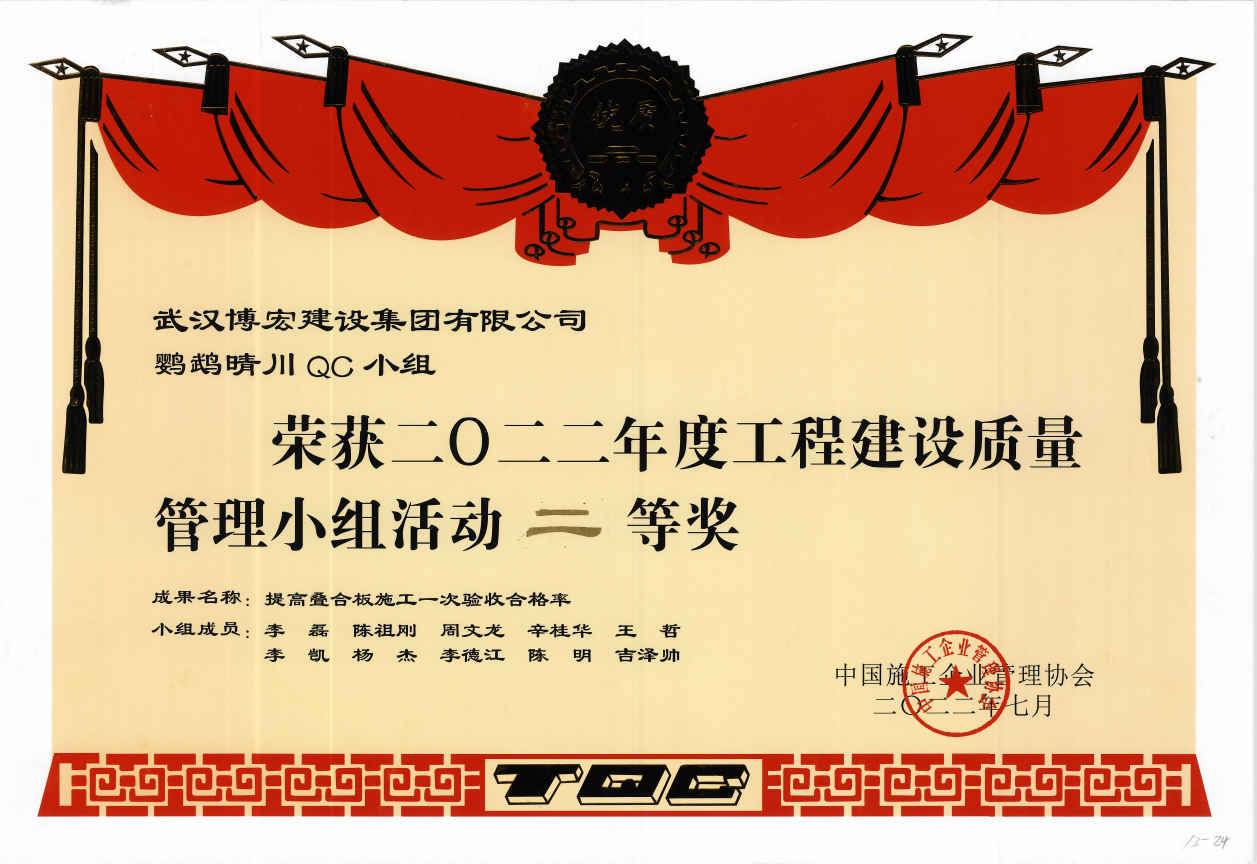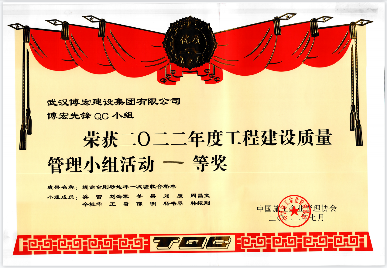 近日,由中國施工企業(yè)管理協(xié)會主辦的“2022年工程建設(shè)質(zhì)量管理小組競賽活動復(fù)賽和決賽”已圓滿結(jié)束,由我司報送的4項成果經(jīng)歷層層角逐,在全國1113個成果中脫穎而出。其中博宏先鋒QC小組的代表成果《提高金剛砂地坪一次驗收合格率》榮獲一等獎、芳草云天QC小組的代表成果《地下室外墻單側(cè)支模體系研制》與鸚鵡晴川QC小組的代表成果《提高疊合板施工一次驗收合格率》榮獲二等獎、博宏機電之星QC小組的代表成果《提高消防噴淋頭安裝定位準(zhǔn)確率》榮獲三等獎,博宏建設(shè)集團QC成果再次取得重大突破!