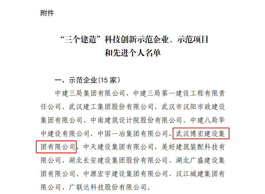 12月28日湖北省住房和城鄉(xiāng)建設廳發(fā)布關(guān)于綠色建造智能建造品質(zhì)建造科技創(chuàng)新工作情況的通報,博宏建設集團入選“三個建造”科技創(chuàng)新示范企業(yè);漢陽市政建設大廈(一標段)、新建商務服務與設施項目(中南科研設計中心)項目入選“三個建造”科技創(chuàng)新示范項目;嚴俊、楊云華入選“三個建造”科技創(chuàng)新先進個人。