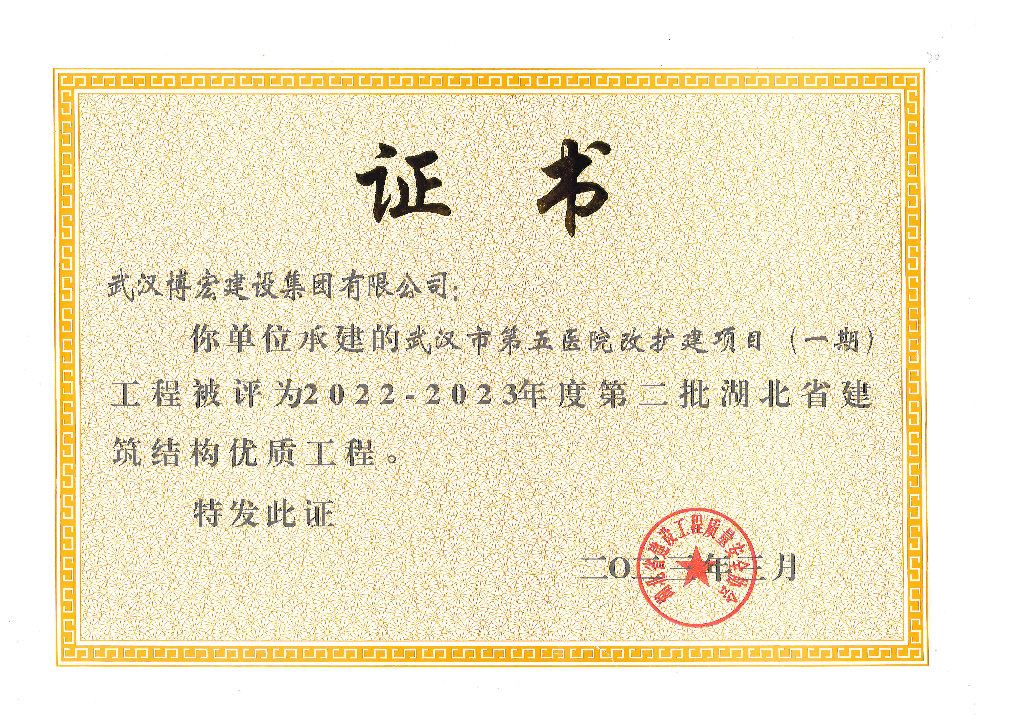 近日,湖北省住建廳2022—2023年度第二批湖北省建筑結構優質工程項目名單出爐,由博宏建設集團承建的武漢市第五醫院改擴建項目(一期)、新建居住項目(長投·長河九里一期)(二標段)3#、5#樓榮獲湖北省建筑結構優質工程獎。“湖北省建筑結構優質工程獎”是湖北省建筑結構工程領域的最高獎項,獲得該獎項標志著該項目在工程結構設計、工程施工管理、材料供應保證、過程質量控制等方面均達到省級領先水平。