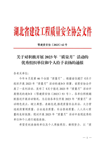 近日,博宏建設榮獲湖北省建設工程質量安全協會2023年“質量月”活動優秀組織單位表彰,李德江、江緒芫、吉澤帥、鄭智秋、王杰、王小勇、劉陽、馬滕、郭永寧、柯善偉共10人榮獲2023年“質量月”活動優秀個人表彰。